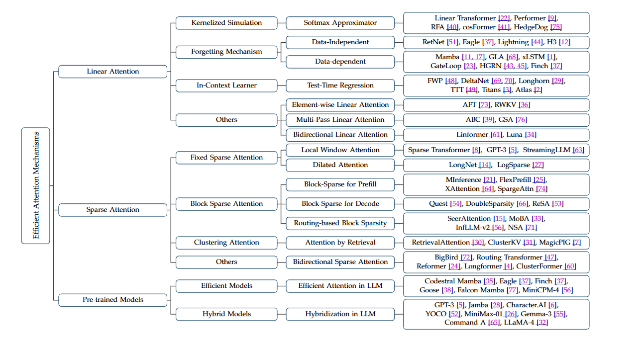 Therefore, the Attention mechanism has become a critical mechanism driving the growth of Large Language Models. Over the years, several variants of the attention mechanism have been proposed such as Multi Query Attention (MQA) (cite), Grouped-Query Attention (GQA), Multi-Head Latent Attention (MLA), etc. For instance, here’s a non-exhaustive taxonomy of efficient attention mechanisms