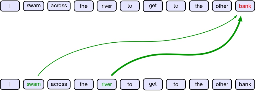 Consider the sentence “I swam across the river to get to the other bank.” The word “bank” has multiple meanings—it could refer to a financial institution or a riverbank. The attention mechanism helps the model understand context by weighing relationships between words. In this case, the model attends strongly to words like “swam,” “across,” and “river,” which provide contextual clues that “bank” refers to a riverbank rather than a financial institution.