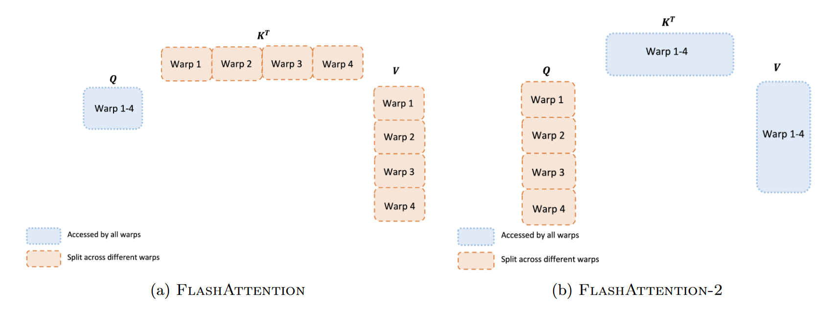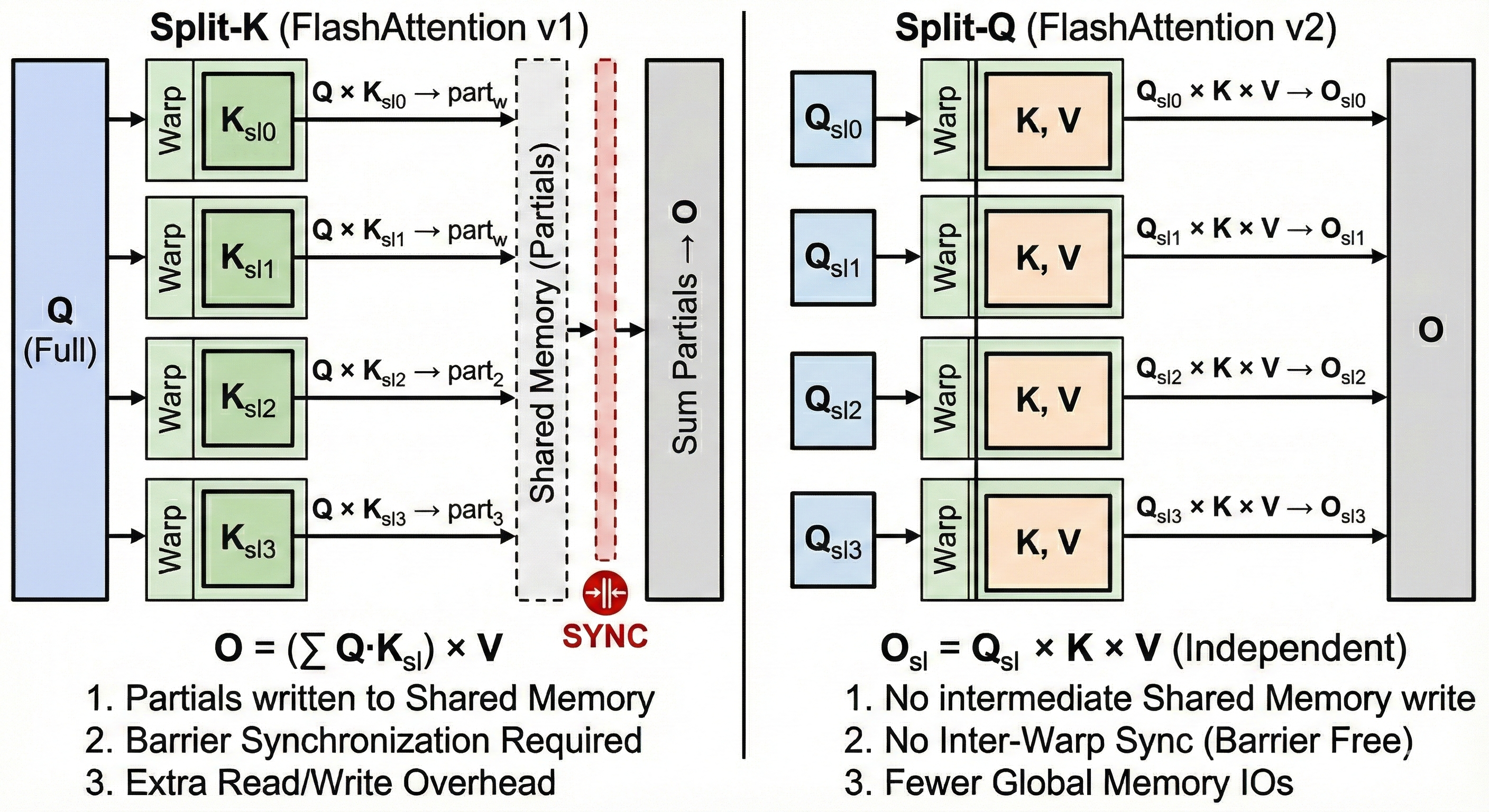 FlashAttention v1 used a “Split-K” scheme where 4 warps each computed a slice of $K^{T}$ and then synchronized to aggregate results. This required writing intermediate results to shared memory, barrier synchronization across warps, and reading/summing partial results.