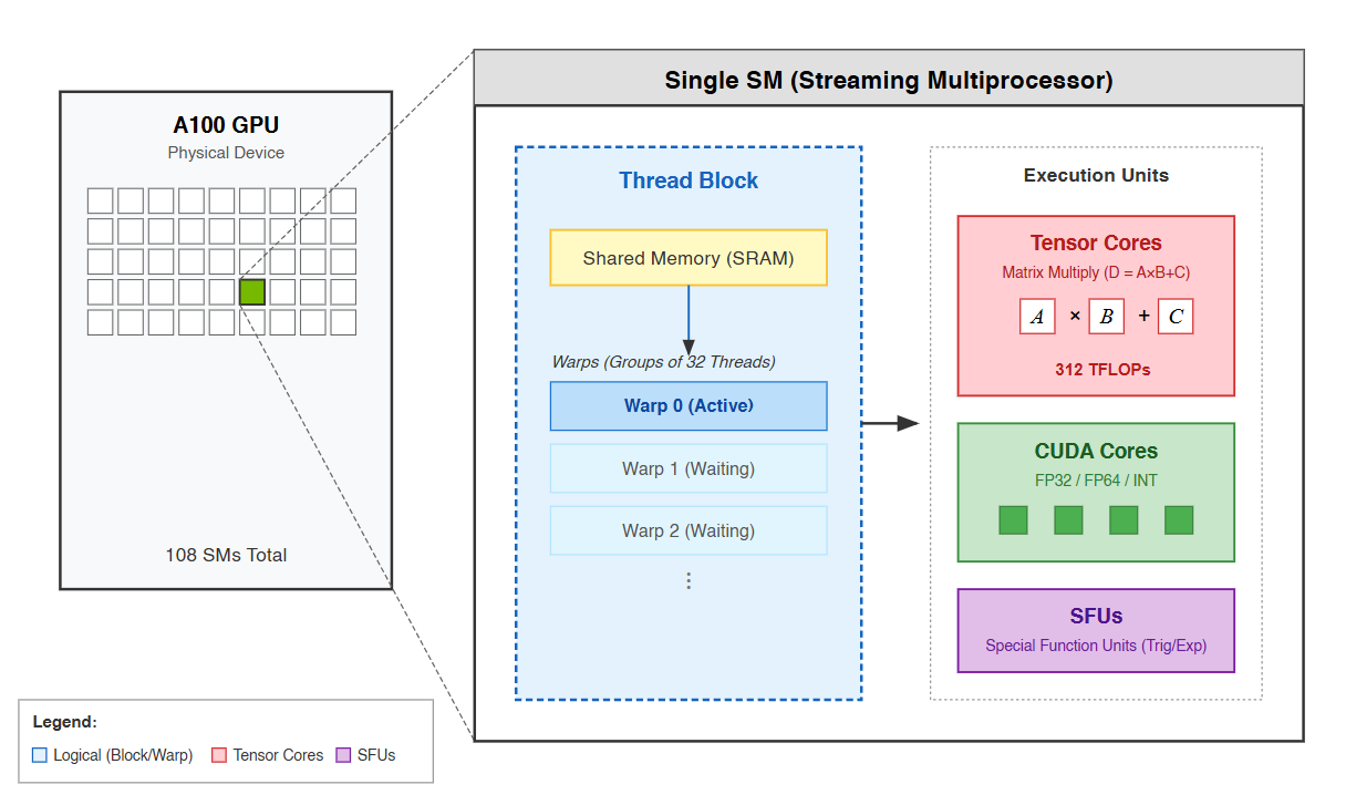 Furthermore, the online softmax in FlashAttention v1 performed rescaling at every iteration. On modern GPUs equipped with Tensor Cores, non-matrix-multiply operations (like exponentiation and division) are significantly more expensive per FLOP than matrix multiplications. For instance, the A100 delivers 312 TFLOPS for FP16 matrix multiplications but only 19.5 TFLOPS for other FP32 operations.