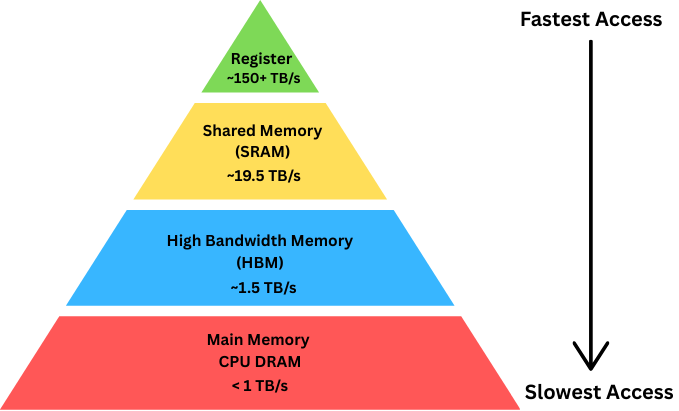 When we look at the GPU memory hierarchy in detail, we see a sharp difference in both latency and bandwidth across levels. Registers and shared memory sit close to the compute units and respond within a few cycles. HBM sits hundreds of cycles away with higher bandwidth but much higher latency. This separation means that the location of data often dictates runtime. As an example, the A100 GPU has 40GB of high bandwidth memory (HBM2e) with bandwidth 1.6TB/s and 192KB of on-chip SRAM per each of 108 streaming multiprocessors with bandwidth estimated around 19TB/s