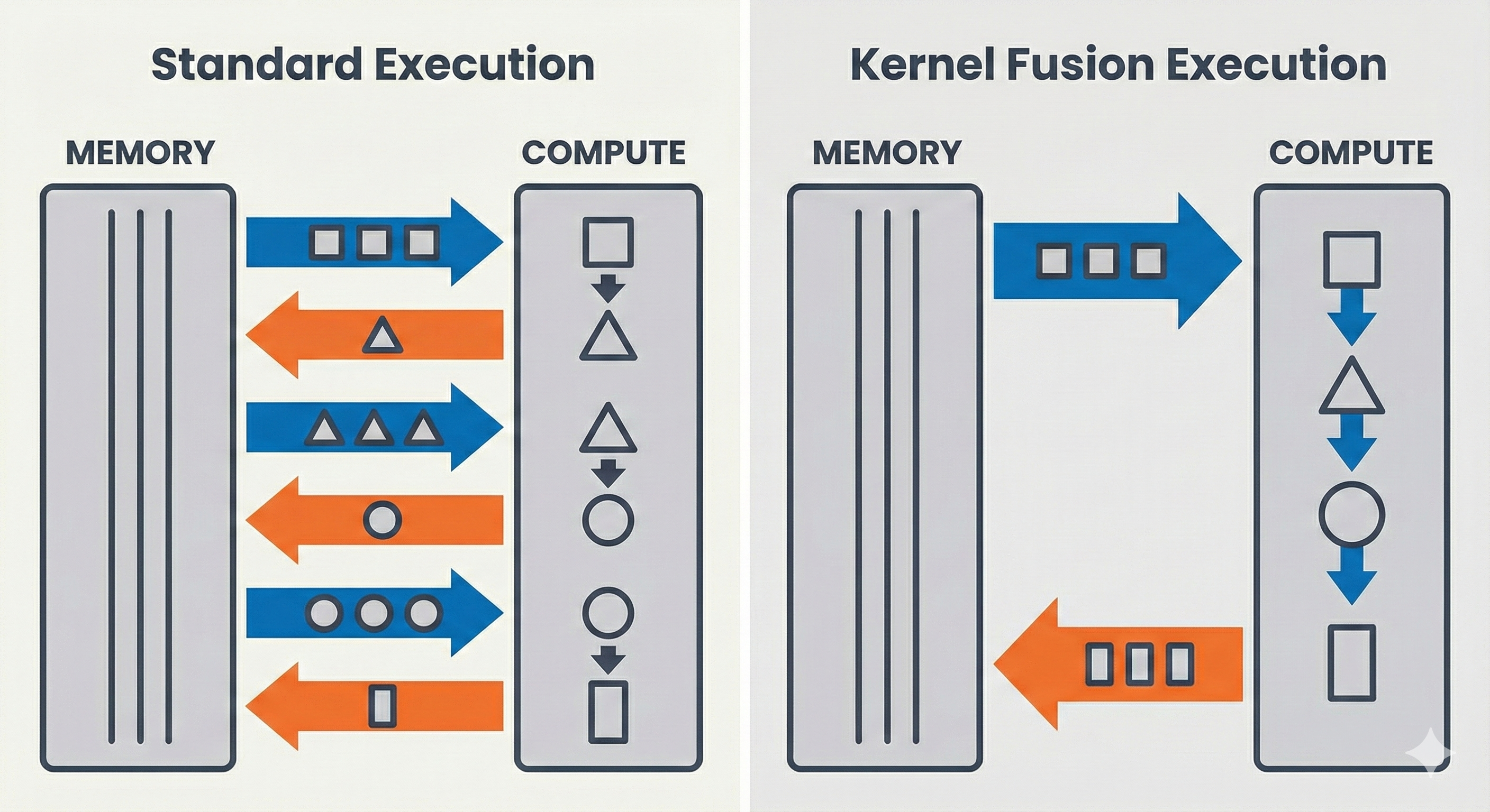 The efficiency of a kernel is governed by its arithmetic intensity, defined as the number of floating-point operations (FLOPs) performed per byte of memory access. Arithmetic Intensity is commonly used to measure whether operations can be classified as either compute-bound or memory-bound. A process is memory-bound when the execution speed is limited by how fast data can be moved between memory (HBM/RAM) and the processor cores, rather than by how fast the cores can compute. Typical examples include elementwise operations such as activation, dropout and reduction operations such as sum, softmax, batch norm, layer norm. A process is compute-bound when the execution speed is limited by the raw processing power (FLOPS) of the cores such as Matrix Multiplication, Convolution