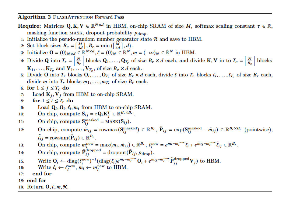 Load Key-Value blocks: Load $K_j, V_j \in \mathbb{R}^{B_c \times d}$ from HBM to on-chip SRAM. These blocks remain in SRAM throughout the inner loop.