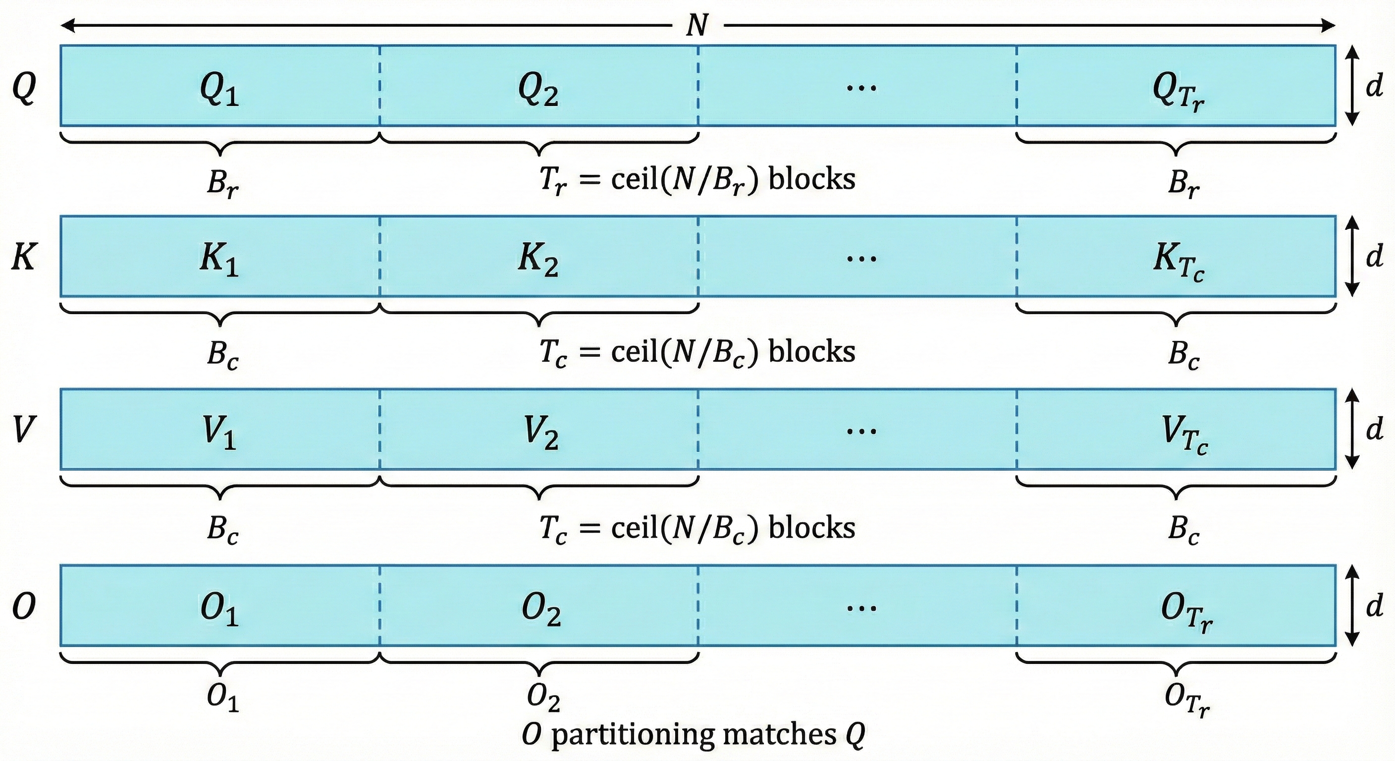We define the block sizes based on the available SRAM size $M$. Let $B_c$ be the block size for columns (dimension along $N$ for $K, V$), and let $B_r$ be the block size for rows (dimension along $N$ for $Q, O$). The key constraint is $4 B_c d \le M$ to ensure that $K, V$ blocks and various buffers fit in SRAM. Usually, we set $B_c \approx \lceil \frac{M}{4d} \rceil$ and $B_r \approx \min(\lceil \frac{M}{4d} \rceil, d)$.