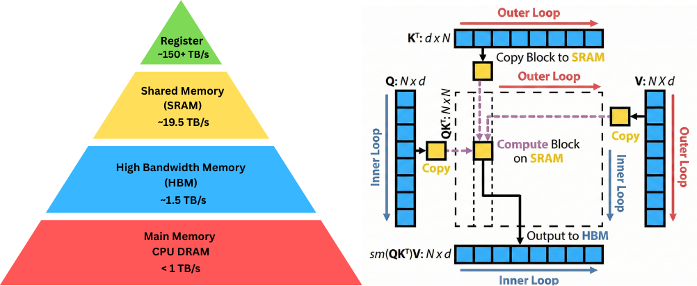 \[\text{Arithmetic Intensity} = \frac{\text{FLOPs}}{\text{Bytes Accessed}}\]Standard Attention involves three primary stages